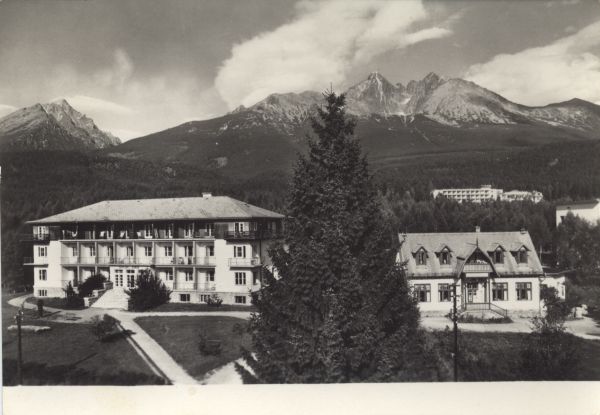 VYSOKÉ TATRY - Tatranská Lomnica (900 m). Zotavovòa ROH Volga. V pozadí Slavkovskę (2453 m), Lomnickę (2634 m) a KeŸmarskę čtít (2556 m)