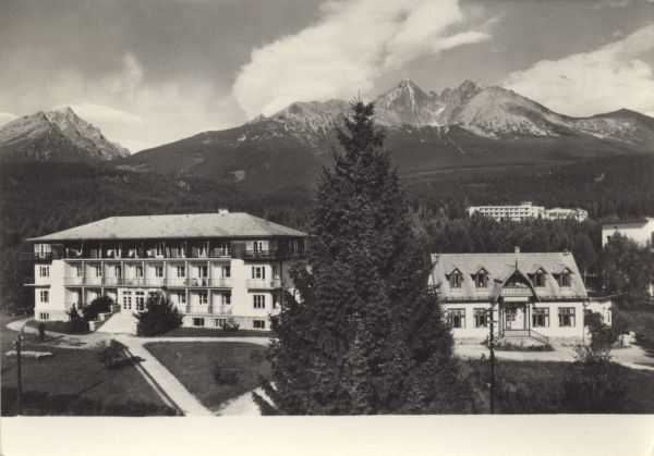 VYSOKÉ TATRY - Tatranská Lomnica (900 m). Zotavovòa ROH Volga. V pozadí Slavkovskę (2453 m), Lomnickę (2634 m) a KeŸmarskę čtít (2556 m)